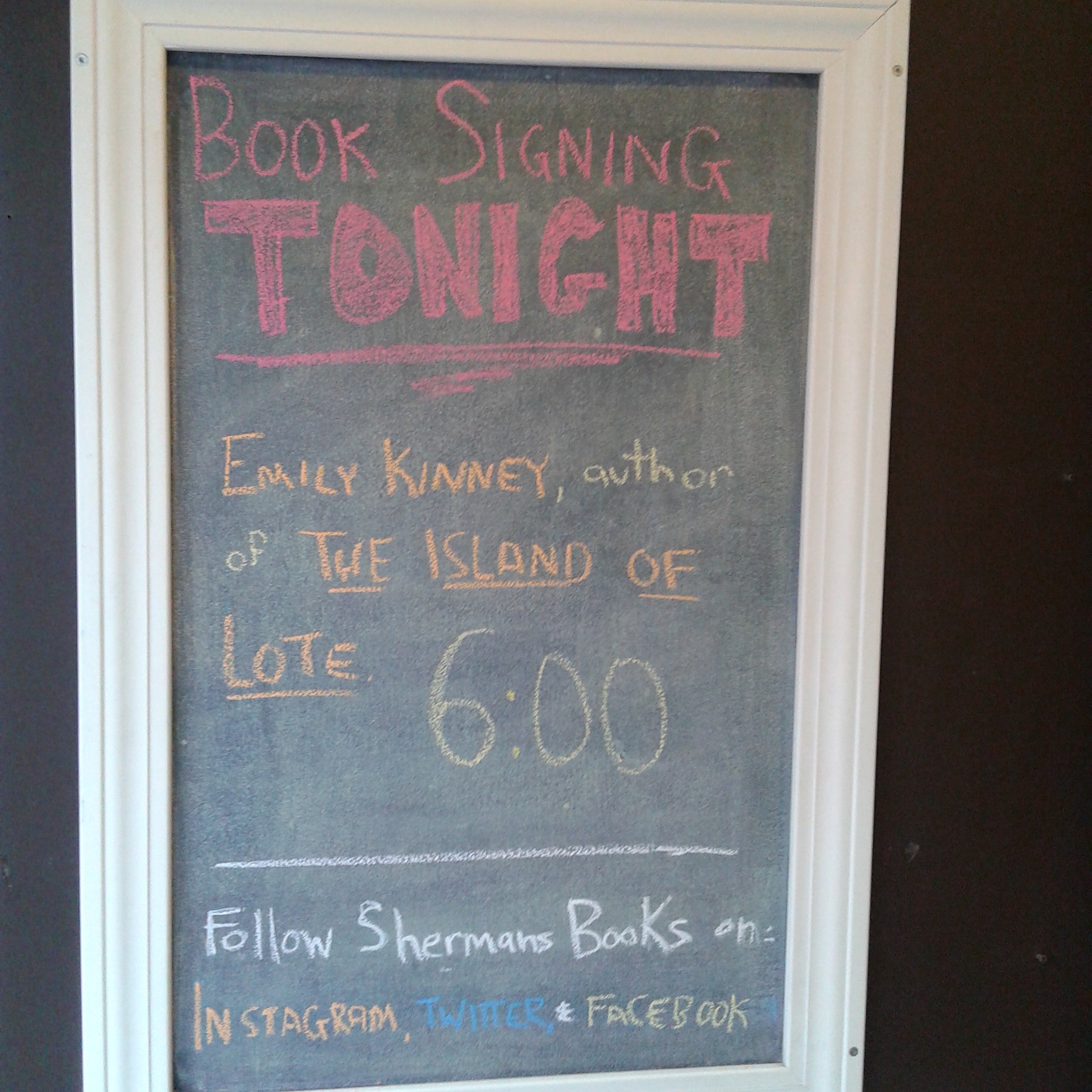 Me at Sherman’s in the Old Port Posted by fueledbywhimsy on April 25, 2015 in Uncategorized | Leave a comment The poster they did for me. My table! They chalked this up for me. My own poster. Front shot. Share this: Click to share on X (Opens in new window) X Click to share on Facebook (Opens in new window) Facebook Click to share on Pinterest (Opens in new window) Pinterest Click to share on LinkedIn (Opens in new window) LinkedIn Like Loading... Related signing. author. books ← “Excuse me?” Aggression’s Skeleton →